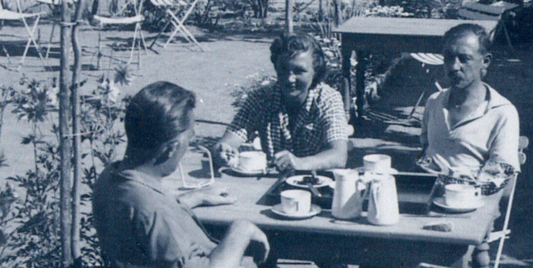 Photographs from plant hunting holidays c.1950s. Clockwise from top left: Nigel Scott and Cedric Morris; Beth Chatto in Corsica; Beth and Andrew Chatto with Nigel Scott, possibly in the Alps; the Chattos and David Scott at an outdoor cafe.