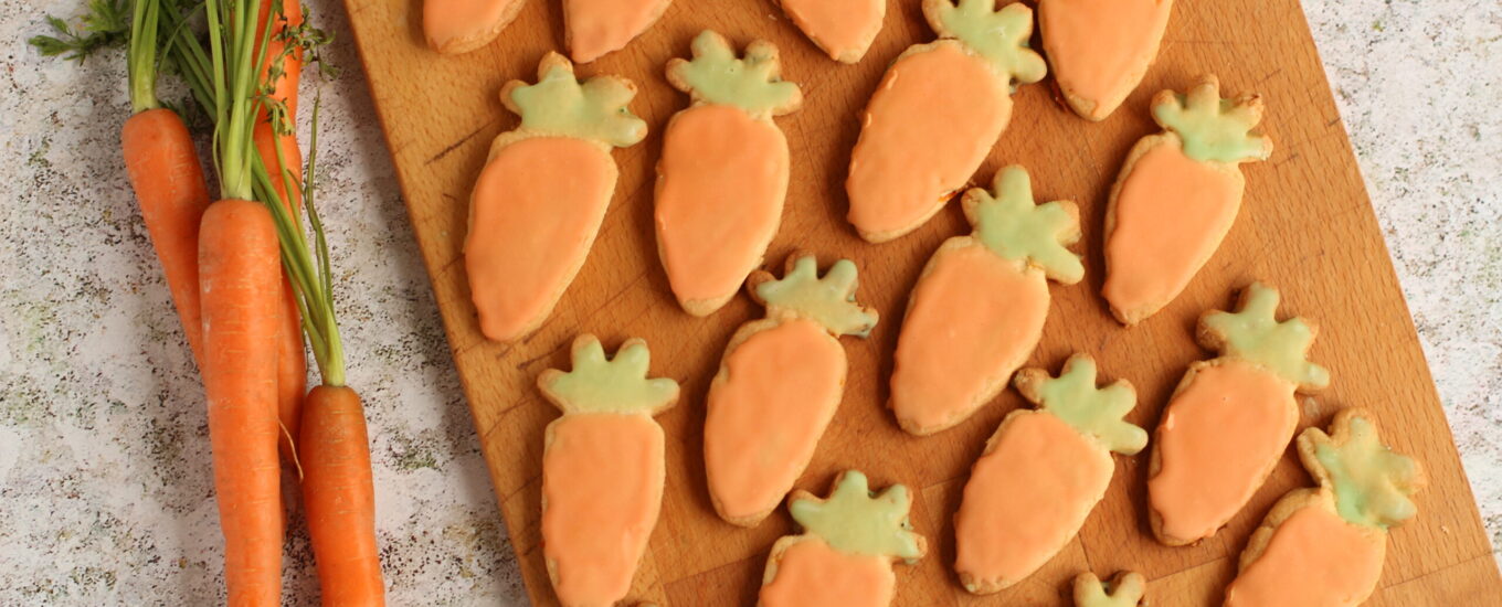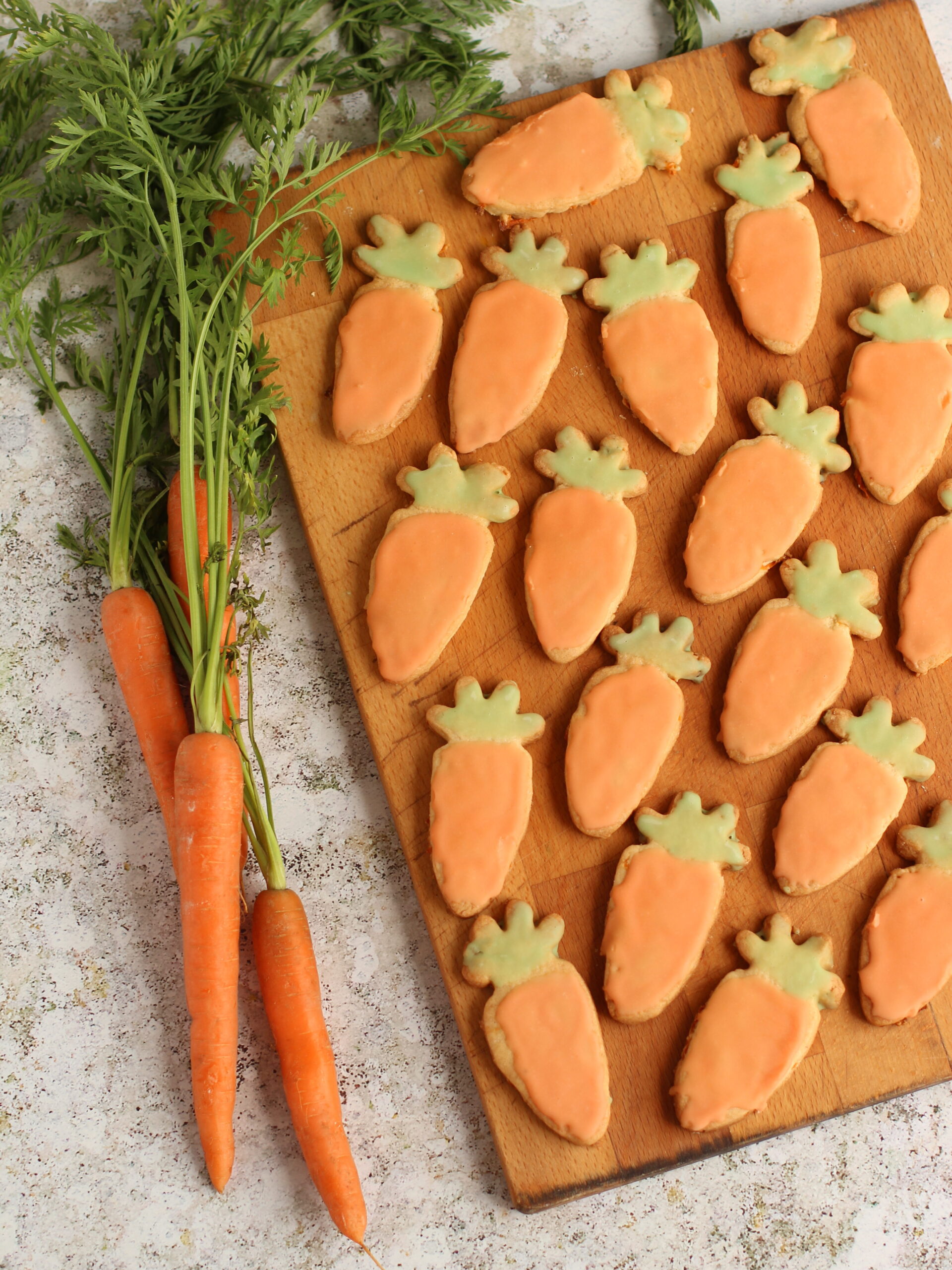 There is no chilling required for this biscuit dough, and they shouldn’t rise too much, so a perfect carrot shape should be achievable. You can find a carrot shaped cookie cutter from most online baking retailers. If you don’t have any cutters an upturned glass is great for circle shaped cookies. You will need a couple of baking trays lined with greaseproof paper and a rolling pin. Makes approx. 44 x 10cm carrot biscuits.
