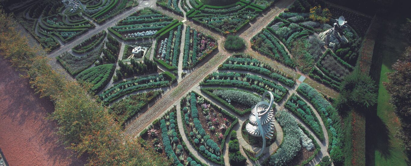 In this article originally published by Drawing Matter, Lily Jencks, Keeper of Vision at the Jencks Foundation, looks at how the drawings by American landscape architect and designer Charles Jencks (1939-2019) for the Garden of Cosmic Speculation in Scotland reveal the meaning and symbolism ingrained in his landscape designs: Gardens have always been the location to contemplate and speculate on man’s place in nature. Gardens bring the macrocosm into the microcosm by the necessity of being a living place, connecting to the wider rhythms, ecological networks, or the even more abstract forces that create our world. When Charles and Maggie Jencks (my parents) started to create what would become the ‘Garden of Cosmic Speculation’, they had already developed design languages and conceptual obsessions in their ‘home as Post-Modernist manifesto’, originally called The Thematic House. What propelled Charles from his passionate championing of a contemporary architecture movement in the late 1970s – earning him the title of the ‘Pope of Post-Modernism’ – out into the Galaxy and back to design this iconic garden? And what can his drawings tell us about his ambition and process?
