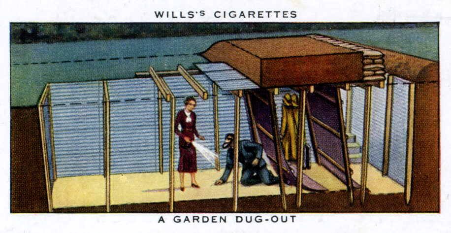 A cigarette card published by Wills’s from their ‘Air Raid Precautions’ series issued during World War II and showing ‘A Garden Dug-Out’ bomb shelter with a woman shining a torch and man wearing a gas mask. Dug into your lawn and covered with earth, the claims for this design include it being ‘gas-proof and will give protection from blast and splinters from high explosive bombs.’