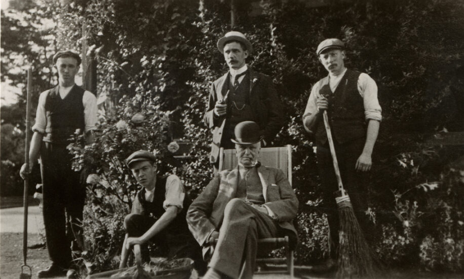 A photographic postcard of gardeners with tools posing next to a seated man and another gentleman behind. Printed New Year wishes for 1909 and annotated ‘These are the men of the family, law, finance and gardeners three’.