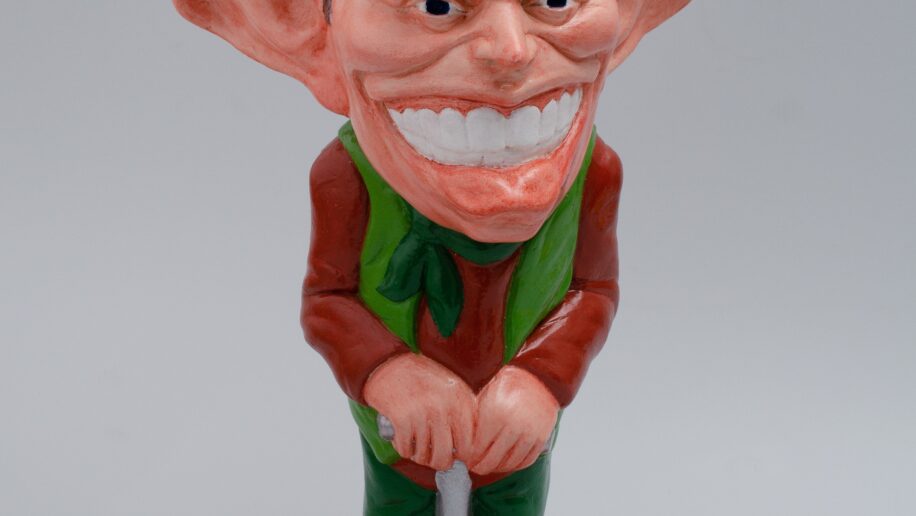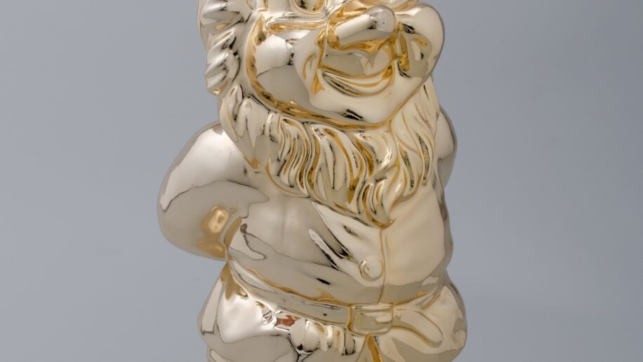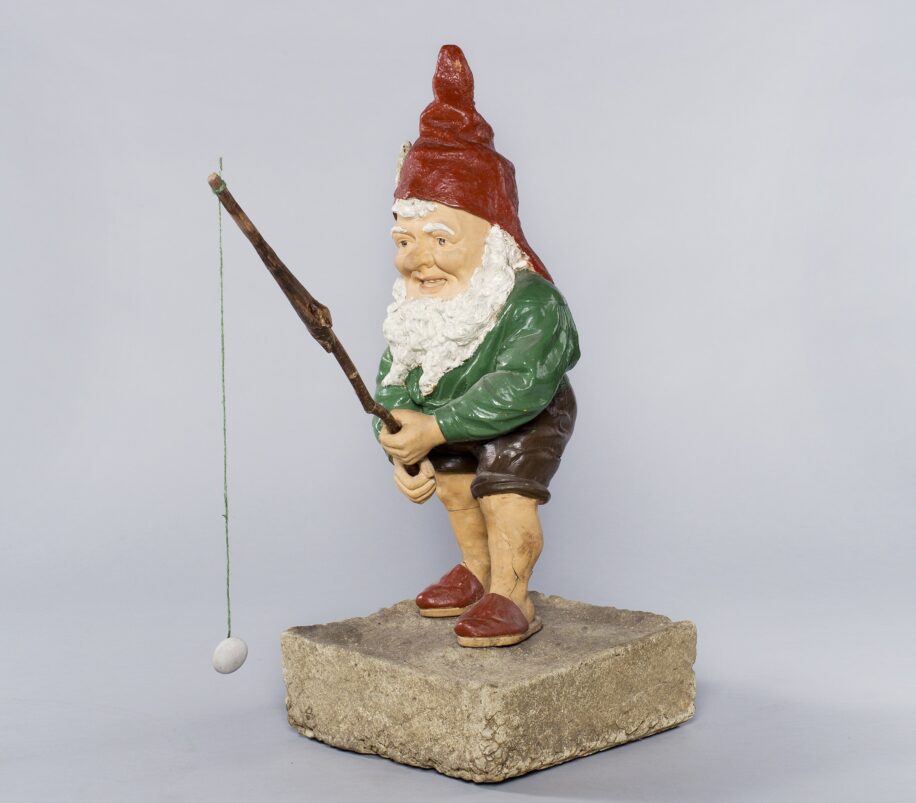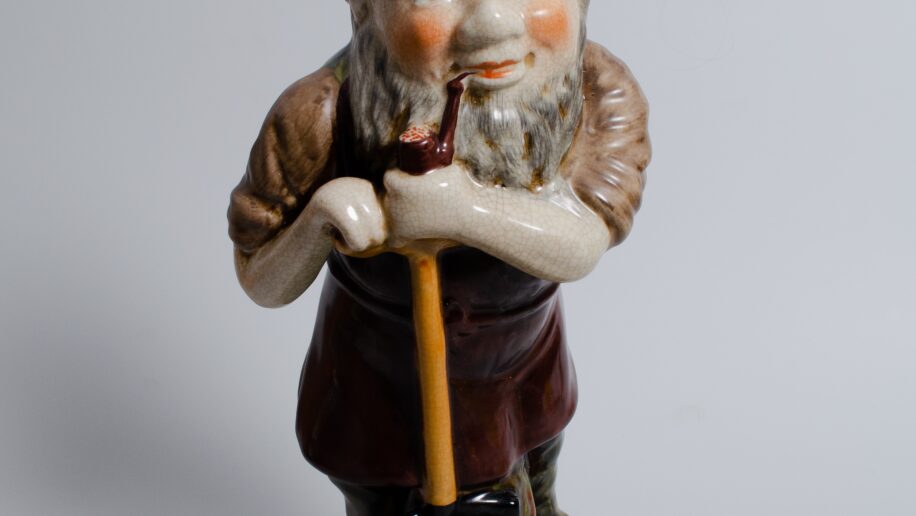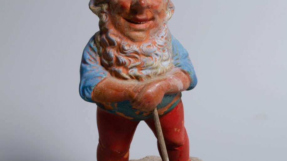 While the origin of the garden gnome is widely contested, it is certain that the idea began at a time when dwarfs, goblins and fairies were alive in European minds. The gnomes we identify with gardens appeared in Germany during the second half of the 19th century. Gnomes made their first appearance in Britain in country houses: the fashion was set by the rockery made at at Lamport Hall, Northamptonshire, where ‘Lampy’ – Britain’s oldest gnome – is on display. Their fall from fashion in modern times is blamed on their association with Germany during the period of world wars, followed by the Disney boom and the introduction of cheap plastic models. In the 1960s Country Life spoke of ‘the regrettable over-population of the race from which we now suffer’. Heissner, one of the best-known names in garden gnomes, started manufacture in 1872 in Thuringia, Germany, heartland of the traditional gnome. This terracotta garden gnome, dressed traditionally in red pointed hat and armed ‘mit angelrute’ dates to c.1900; it is the oldest gnome in the Museum collection. The fishing gnome is the rarest figure in a rare set of eight of gnomes who fish, shoot and play golf in a ‘Fairyland’ Alpine setting. He arrived at the Museum without a fishing rod, and is sufficiently heavy that he can only travel up and down the building in our lift.