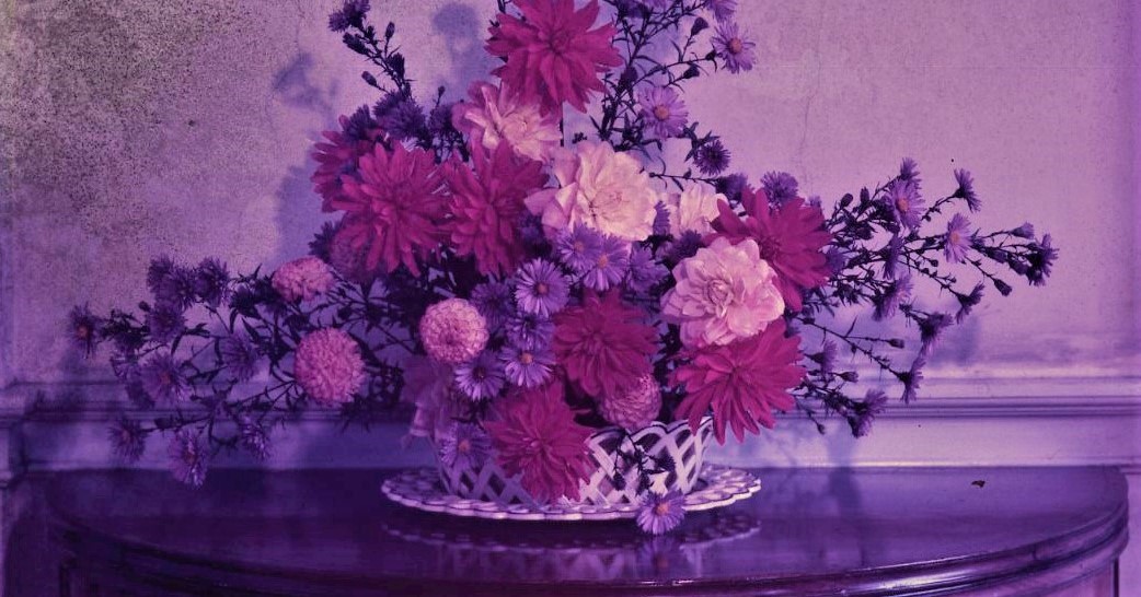 My childhood fear of flower arranging has been summoned by a photograph of Constance Villiers Stuart, standing proudly next to an imposing floral display. I am being told off by my grandmother for sticking my fingers into green floral foam. As a fidgety five-year-old, the soft yet crunchy substance was an irresistible toy. I had crushed it beyond recognition and rendered it useless for the church’s Sunday display. Leafing through the envelopes of kodak transparencies, I noticed that Constance’s arrangements left more room for fun and experimentation than my own memories of the church displays. Asymmetry, fallen petals, bold receptacles, and accompanying trinkets were all features of her compositions. No flowers were deemed garish or inappropriate. Common cottage plants like fuchsias sat beside majestic dahlias.