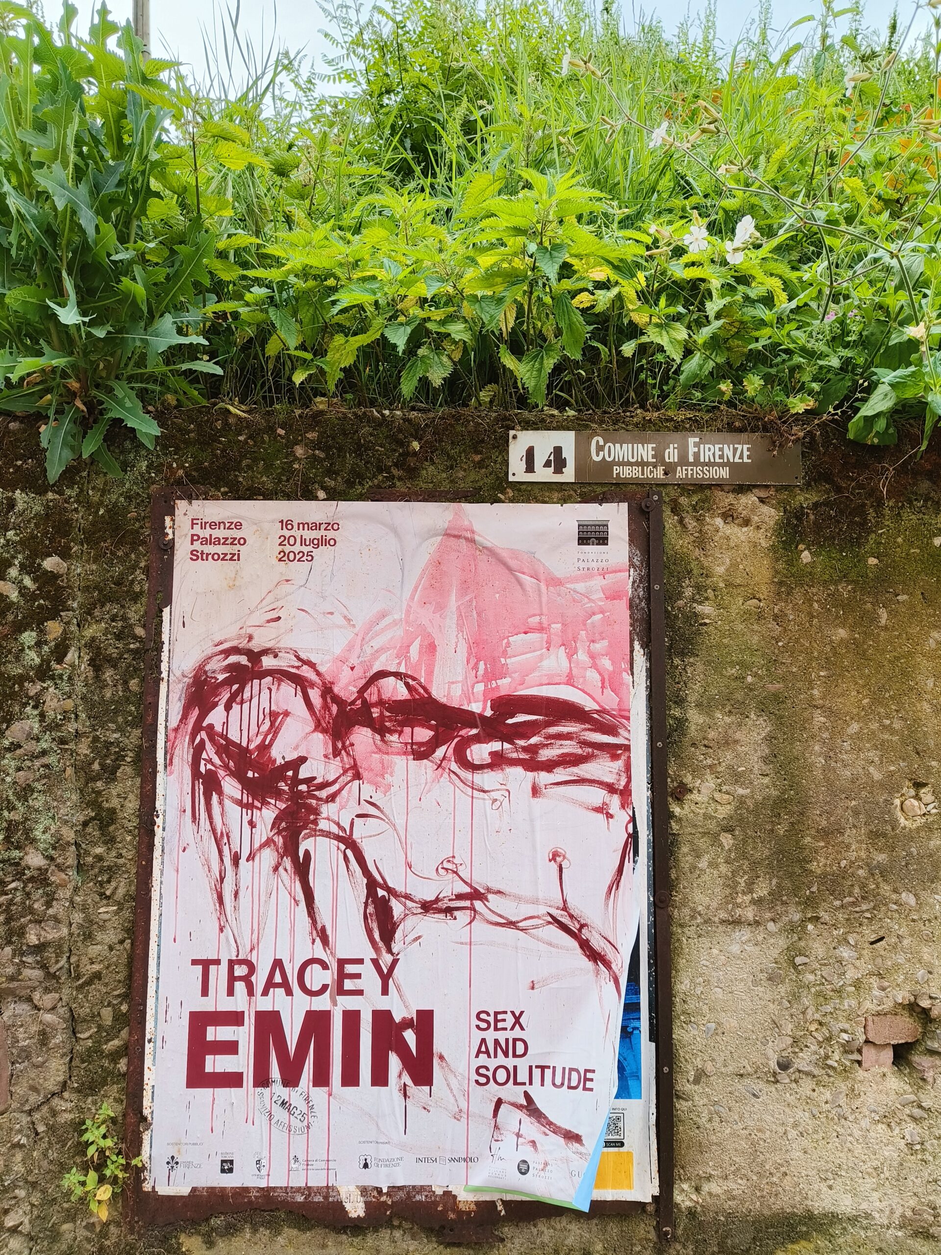Out the other end, we landed in the splash pool of the plaza, transformed and tired, but not sure how. We grabbed pizza and I felt the inevitable churning of the cramps of my period begin, the hot blood needing to be contained, not to redden, and certainly not in public. It was then that we decided to see Tracy Emin’s show Sex and Solitude at Palazzo Strozzi and for the first time that day I felt in my body. The rooms were empty, just outstretched limbs sweating down the canvas, streaks of crimson red clotted between the frame, and unwashable stains pressed up right next to the marble.