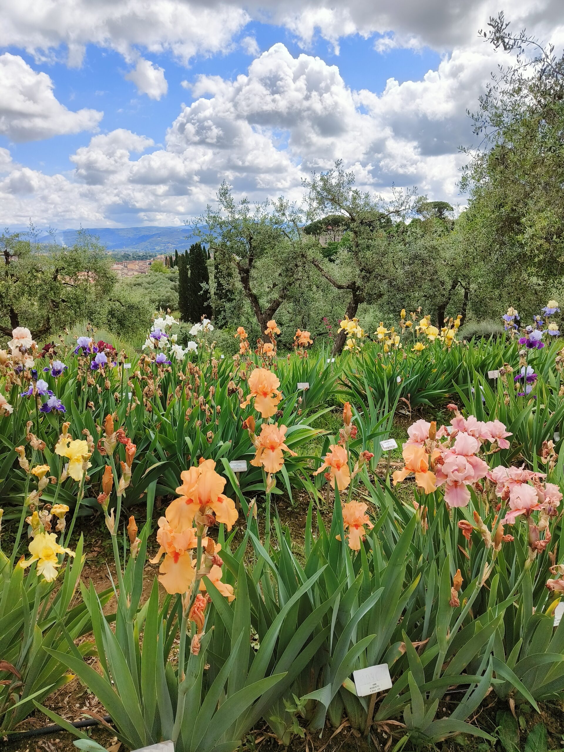 I was expecting neat rows of irises in a formal arrangement, but the garden, a former rubbish heap, sat in a wild and rich olive grove upon a hillside looking out to the Tuscan Valley. Irises rose up more in clusters than rows growing among wild grasses and flowers which clambered down the rocky side. The garden built on years of competitions is becoming an archive of silky purples, pinks, bronzes, blues, whites, all dissolving time on this hillside.
