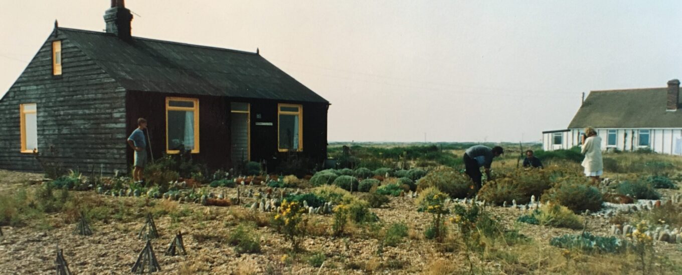 Shaun Kiddell, Parks Policy Advisor at National Lottery Heritage Fund, shares his memories of visiting Derek Jarman at Prospect Cottage in the early 1990s, along with his own photographs from that day: I have a very fond memory of being very fortunate enough to visit Derek in his garden at Prospect Cottage, Dungeness. Although the memory of that wonderful afternoon is crystal clear, and I can recall that it was a hot sunny summer Saturday, I am slightly unsure of pinpointing the exact year. It may have been the summer of 1991 or 1992. Derek’s movie The Garden had recently been released, which had shot Derek’s beachfront hideaway to fame. Following the release of the movie, Jarman fans, movie buffs and of course us fellow gardeners were keen on a pilgrimage down to this odd little corner of Kent. To find this extraordinary garden surrounding his neat little cottage, nestled among the shore-lined shacks on a weird, lonely desolate beach-side location under the shadow of the imposing Dungeness power station. To me, Dungeness was, and still is, quite unlike anywhere else in Britain. At that time in the early 1990s it was widely thought of (though later disproved) to be England’s only piece of official desert. And back in those days Prospect Cottage stood out more than it does today, as every other property on the strip was much more ramshackle and there used to be far fewer people around. Back to that sunny Saturday. I happened to be staying at Sissinghurst Castle Garden with my friend Graham Harvey who was a gardener there. He lived on the estate in the former shepherd’s cottage, that sadly is no longer in existence. We arrived at Prospect Cottage to find Derek trimming the deadheads off and re-shaping his cotton lavender with a lovely old fashioned pair of wooden handled shears. He was genuinely pleased to greet us and was interested in us both being gardeners. He also seemed a tad impressed Graham worked in the gardening team at Sissinghurst. Derek recounted that he knew he would receive many more many visitors once his garden was featured in his movie. I have a great collection of photographs from our encounter. Not only did I still have hair back then, being only about 25, but the photographs capture Derek and his friend, those lovely wooden handled shears and how low the garden planting was back then. None of the height that the shrubs have more recently given the plot. We so enjoyed talking plants, gardens, gardening.  He also recounted to us receiving a dressing down for introducing non-native flowers he liked, that some thought would invade the local area and seafront. The cottage was a little different back then. The windows in the cottage had a large single pane with just a top opening, the poem on the side was yet to exist. The garden as you would expect has changed a little in the 30 odd years I’ve known it. My early photographs reveal few simple beds on the frontage and intricate patterns and designs from artifices, stones and shells. My guess is many of those have most likely been lost to trophy hunters and souvenir collectors. I’ve also seen maintenance vary over the years, but the essence of remarkable artistic man remains. Derek graciously showed us round, and by coincidence a lady photographer also parked up at the same time and began to photograph the garden. This lady turned out to be the fabulous garden photographer Tommy Candler, who went onto become a friend and came to photograph me at Heathfield, a country estate close to Croydon that I was restoring soon after the Prospect Cottage meeting. I’ve been very fortunate to visit Prospect Cottage almost every year since meeting Derek way back all those years ago. I’ve also been very fortunate to see many many shingle and dry gardens, many artist creations, yet none of them ever compare to the romance and uniqueness created by Derek at Dungeness. I’m so very proud to be part of the organisation responsible for preserving Prospect Cottage, being the parks and gardens person at National Lottery Heritage Fund, and our parent the National Heritage Memorial Fund, that generously joined forces with the Art Fund to secure the future.