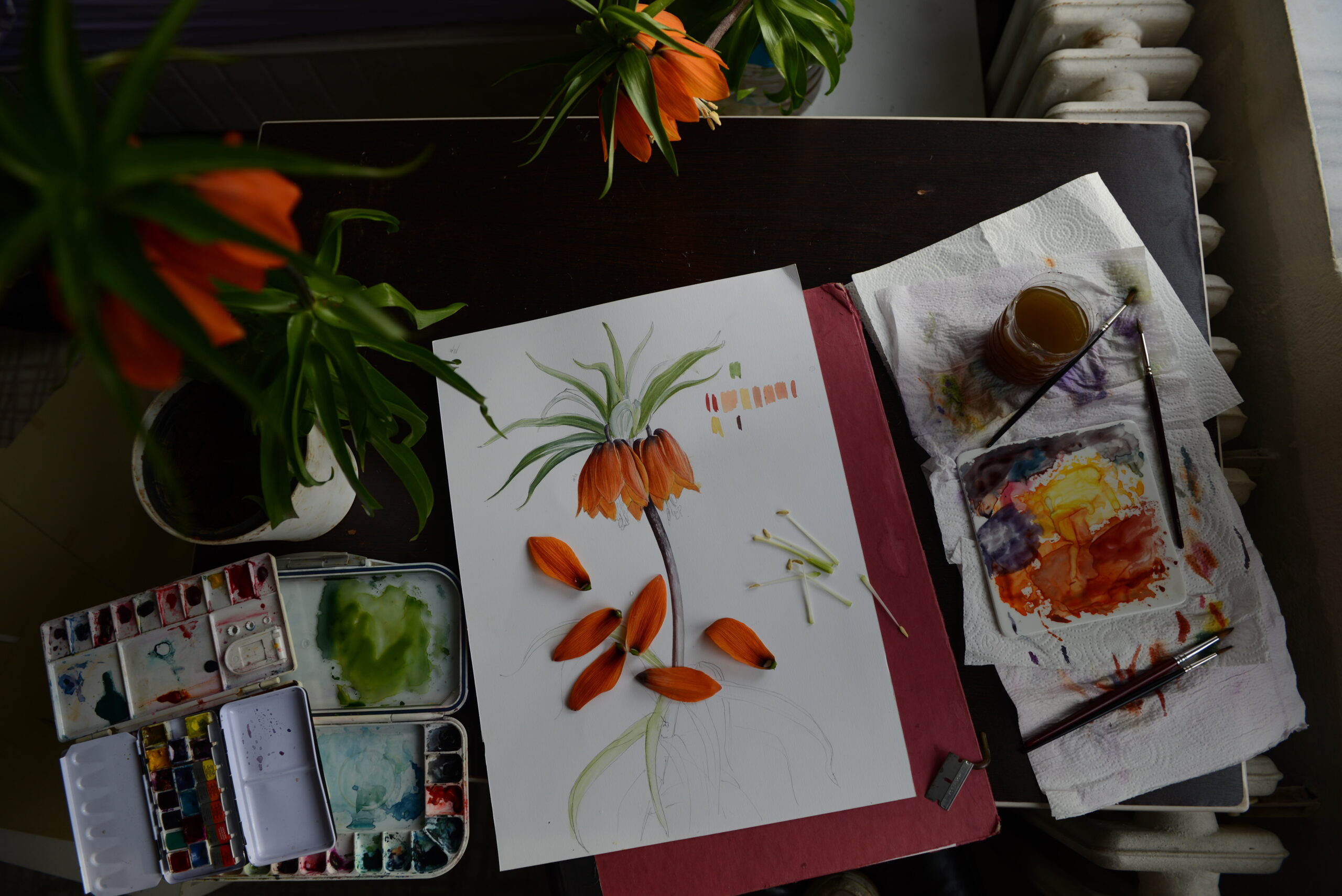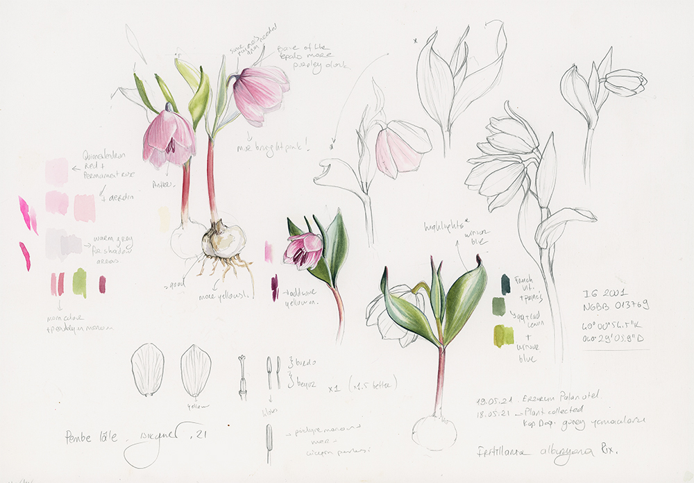 When the fritillaries began to bloom, together with botanist Aşkın Öykü Çimen, I returned to Sason. Yet, as soon as we arrived, we learned that Mount Halkis had been restricted for security reasons. Once again, the I. gatesii was beyond reach. But the fritillaries — they were everywhere. Climbing the red hills, we found slopes covered in blazing clusters of red, orange, and yellow. It was overwhelming, almost unreal. Among them, I began to imagine my composition: not a single flower, but a living cluster, just as they stood in the wild — vivid, abundant, and full of life.