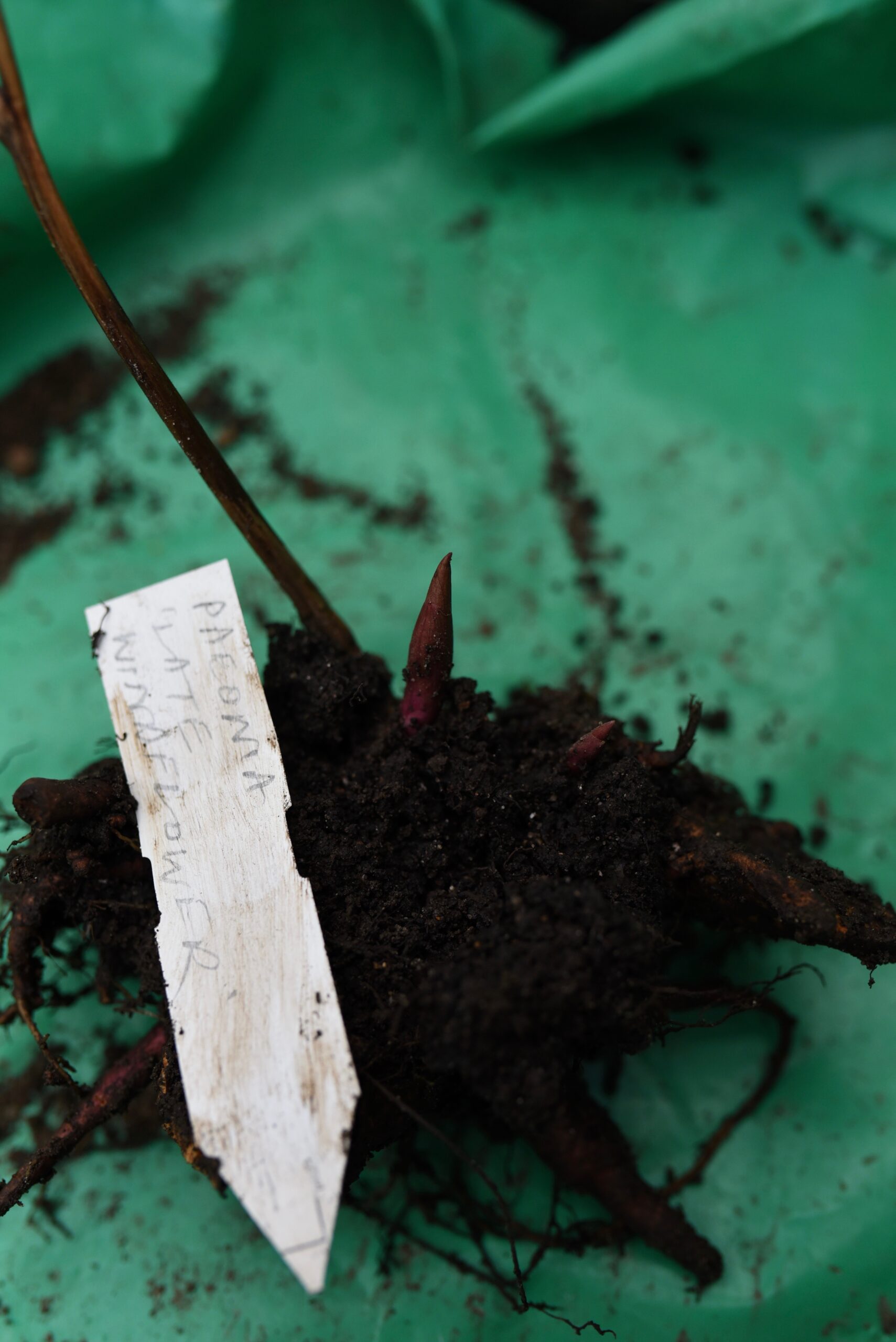 The day moves along swiftly, a clipboard is found for me, unbelievably, to start a list of plants I want! We criss-cross the garden, pencil in hand, camera active and questions firing. Every plant seems to have a tale of a giver, a place where it first occurred, a plants person who discovered it and another who named it after them. We’re especially on the hunt for plants John received from Cedric Morris. And first up is a peony which John knows to have come from Benton End. Paeonia ‘Late Windflower’, was bred by Professor A. P. Saunders in 1939, it’s a very elegant hybrid of 2 species peonies. Such peonies are multiplied and shared by division and so when John heaves upward the blade of his narrow spade and cracks off a chunk of the peony, we know we’re returning exactly the same plant as Cedric grew back to the garden at Benton End. John hands me a hefty chunk of the woody rooted peony, several red buds present signs of life. Little fragments of Saxifraga rotundifolia carry too upon the soil clinging to the peony.