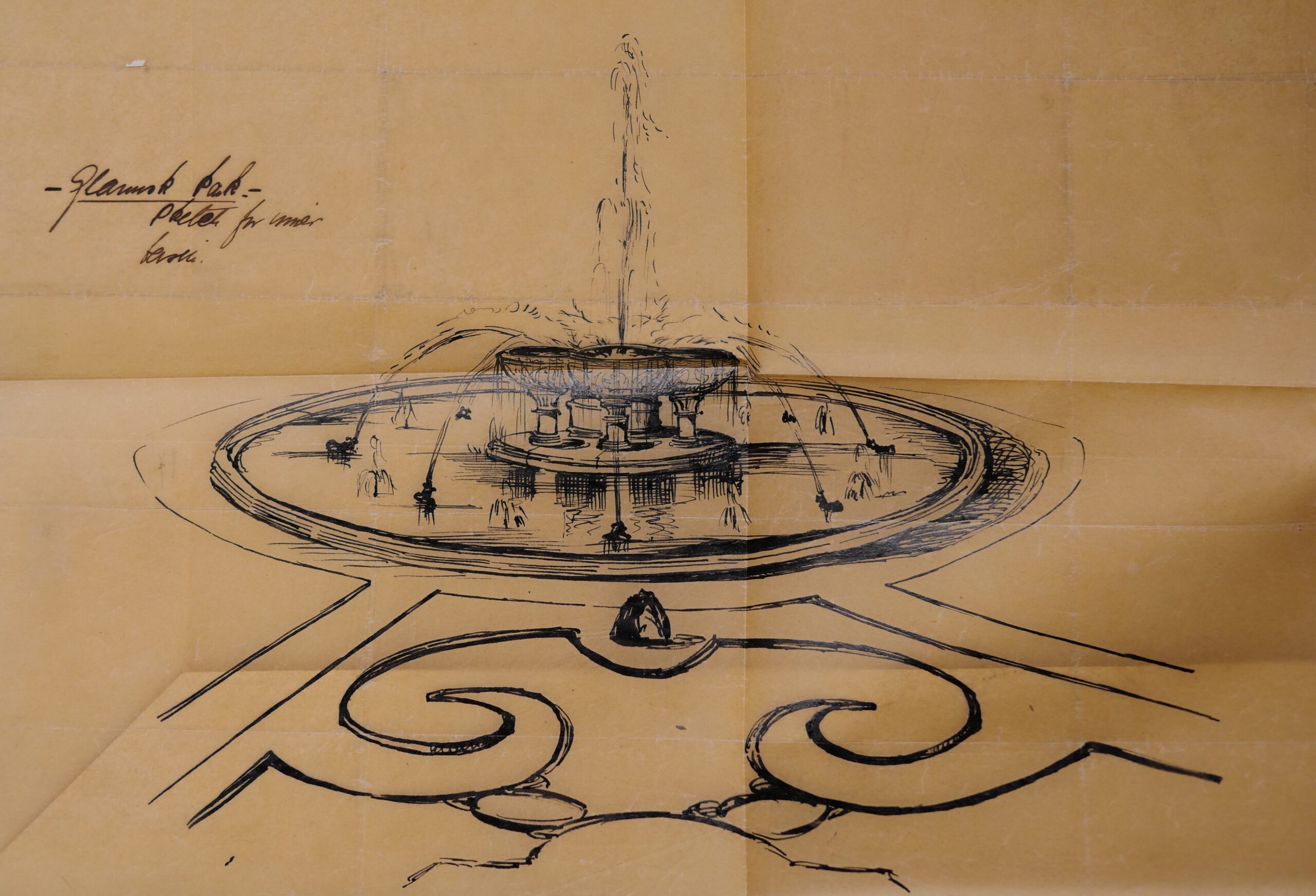 William Andrews Nesfield was born in 1793 in County Durham. After a career in the military he took up watercolour painting, followed later by a career as a landscape architect. He quickly became one of the most sought-after landscape architects of the mid-Victorian era, and set up a professional dynasty with his sons. The archive contains detailed designs for the iconic fountain at Witley Court, even including intricate preparatory studies sketched by William Nesfield of the fish and seashells that feature. The fountain and gardens were recently the subject of significant restoration, and still attract many visitors each year. Other surviving designs represented in the archive are the spiral fountain at Alton Towers, and the parterres along the Avenue Gardens at Regent’s Park.