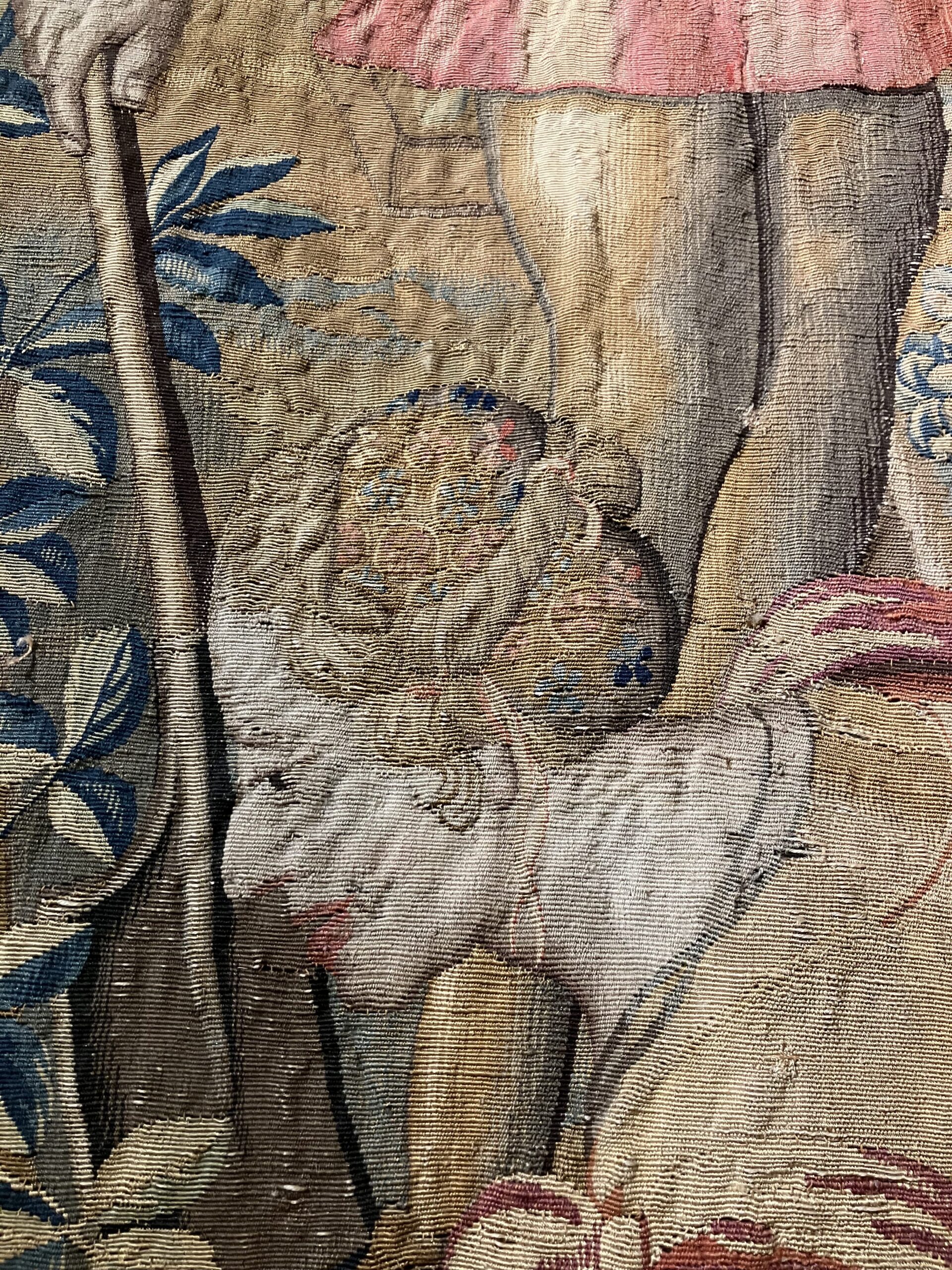 The intentionality of this tapestry series is to display occupations – suggesting a professional status to the female’s role and as such a totally unique example. She is finely clothed in a long-sleeved dress with puffs of material cinched into a bow at the shoulder and with ruffled cuffs at the wrists. She wears a finely decorated headdress decorated with quatrefoil flowers alternating in rows of blue and red. The couple in the picture wear finer clothing and the other gardeners wear simple smocks depicting a variety of economic status and therefore its likely to be a rare illustration of patron, head gardener and his wife and under-gardeners.
