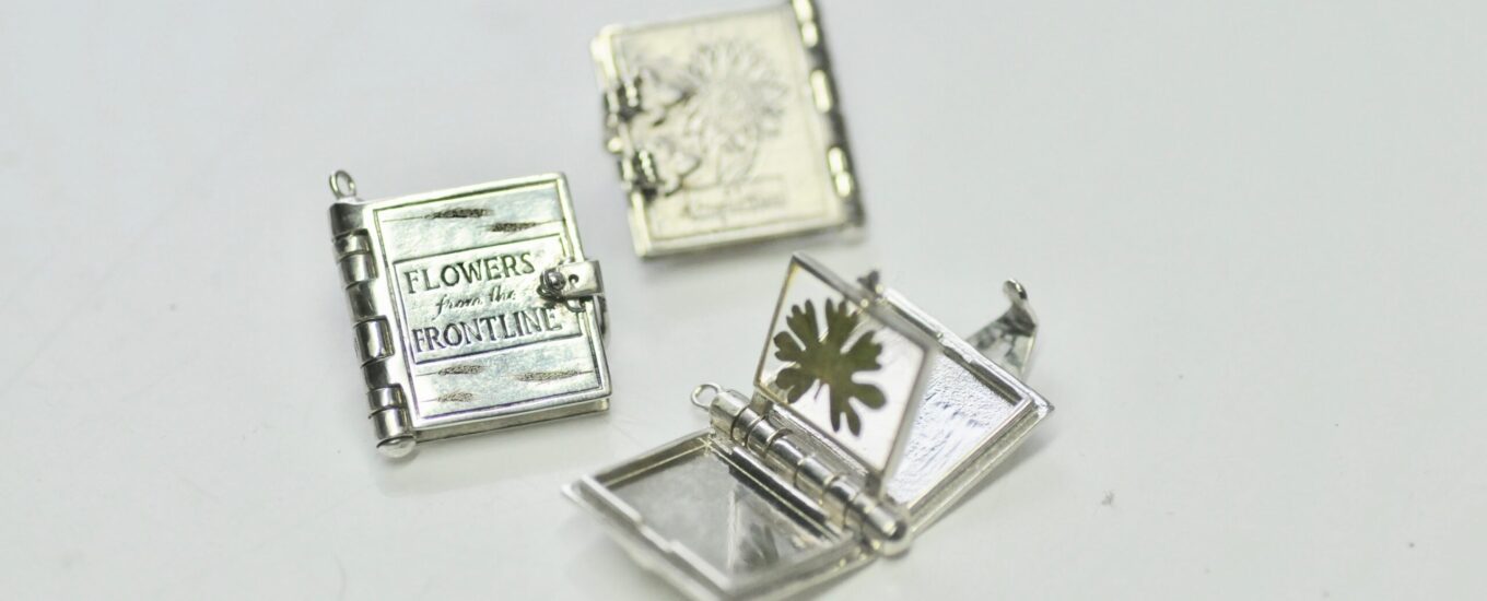 The series is made up of five miniature flower books in silver, with a single rotating flower page. I came across several Edwardian antique book charms that were taken on pilgrimages and I really liked the movement of opening a secret that is worn close to the body. I wanted a single rotating page that had a war flower inside a clear page and after experiments, working with clear resin seemed the best way forward to capture them. The engravings are based on drawings I made of the wildflowers, and I added the trident and sunflower element to connect the flowers to their home. Thanks to the patience of Serhii Ovcharenko, the books came about after five rounds of revisions – the clasp in particular was a fiddly one to fine tune with its double lever, but I am so happy with them.