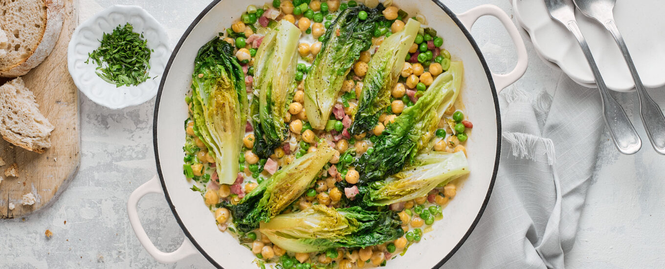 Cooked lettuce is best for days when the calendar says summer, but British weather is giving you damp autumn. A variation on a French-style recipe for braising lettuce with peas and sometimes bacon, which I once tried in a pub in, err, South East London. Just a little pancetta is used in this braise, most of the body comes from the lettuce, peas, and chickpeas. It’s a really good example of how meat can be used in small quantities to add depth of flavour but doesn’t distract from the vegetables. Serve with bread to mop up the juices, or with rib-sticking mashed potatoes for something more substantial. You can try substituting the gem lettuce, for larger romaine, cos, or wedges of endive.