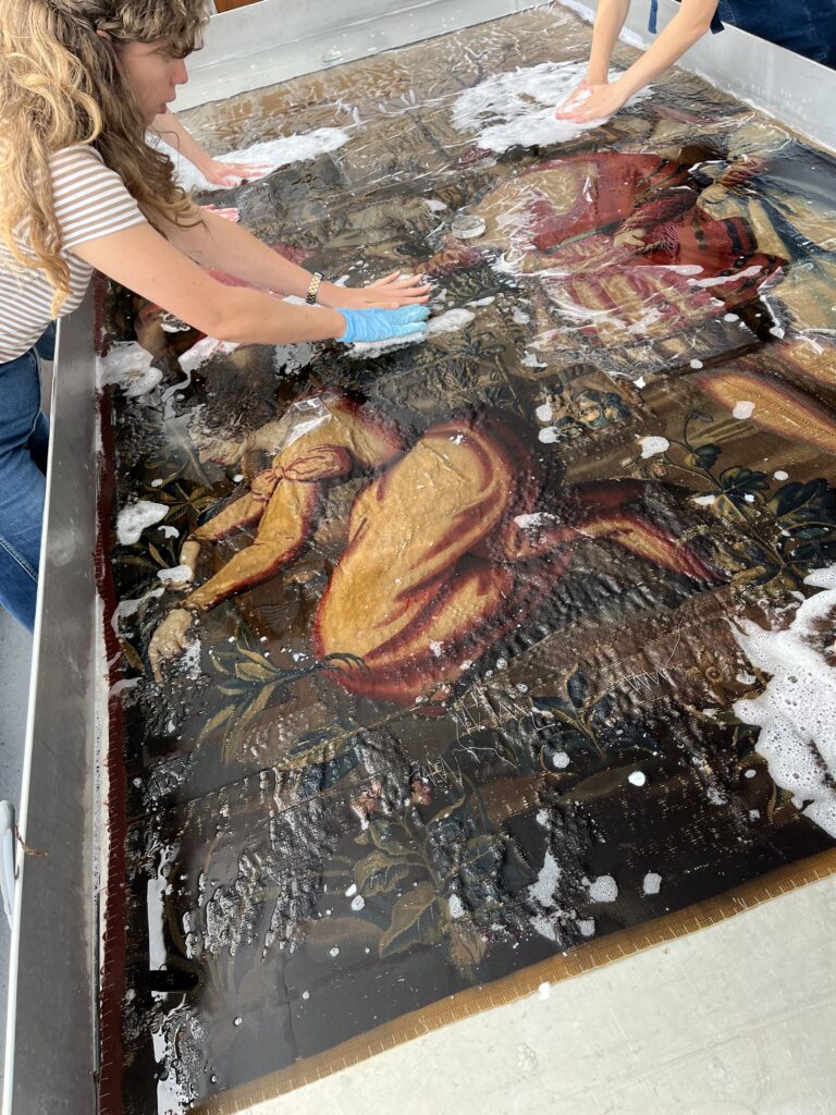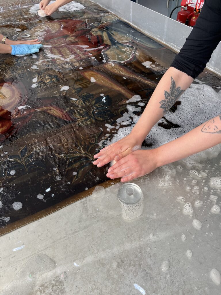 The tapestry was laid out in a large, flat wash bath, initially face up to soak in water. Delicate areas of the tapestry had netting stitched over them to protect them during washing. Water was added with a very diluted detergent and then sponges were used to gently work over the surface of the tapestry. The water was drained and sampled to see how much cleaner the tapestry was becoming. The level of detergent in the water was decreased in subsequent washes.
