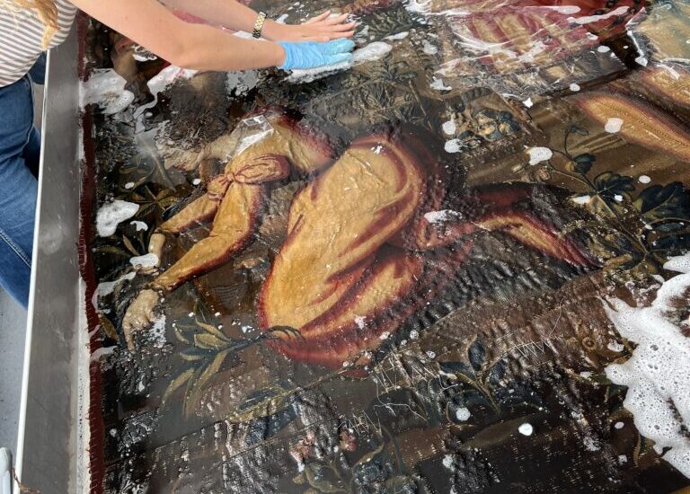 The tapestry was then alternated between face up and face down so that both the back and front are cleaned equally. The surface was worked over with sponges each time to help dirt particulates be released from the wool and silk fibres.
