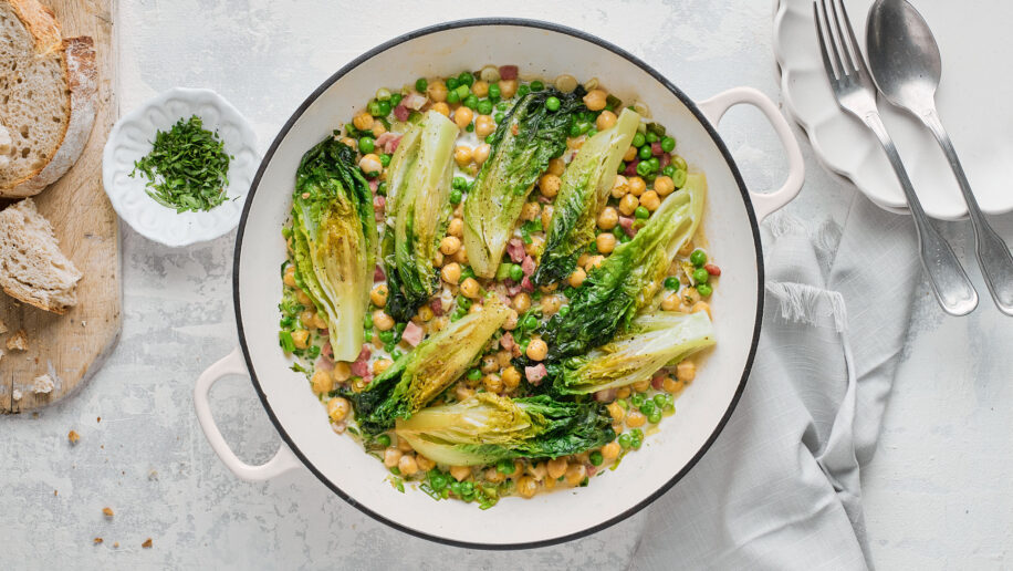 Recipe | Braised Baby Gem, Pancetta, and Peas, by Ceri Jones