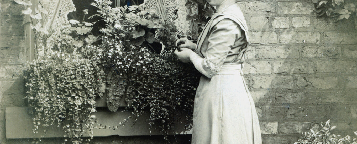 The oldest example of a window box in the museum collection is this 17th century illustration of a girl in a window. We don’t know much about it, only that the engraving is 17th century and it appears to be northern European, with echoes of Flemish and Dutch art of that period. Like me, her windowsill houses a slightly mismatched collection of pot sizes, and the flowers on the left (carnations?) have flopped over, possibly too top heavy for their small vessel. The girl is making use of every inch of space, cramming in a bird cage, corn, herbs, vines, citrus fruit and flowers. It’s a whole world around a window.Window boxes have existed since at least ancient Rome, where city dwellers without access to their own land and gardens grew culinary and medicinal plants out of their windows. Over time this evolved into decorative floral displays. In the first-century Pliny the Elder (Roman philosopher and author of Naturalis Historia) wrote of villas with blossom-filled window sills where ‘every day the eyes might feast on this copy of a garden as though it were a work of nature.’This phrase copy of a garden is sticking with me on my window box quest. I want my windowsill to feel like a miniature garden, layered with texture and interest throughout the seasons.In the early 19th century window boxes really started thriving in Britain, and the Garden Museum Collection is brimming with photographic evidence. The introduction of mass production meant pots and planters were more widely available, and the emergence of a new middle class in Victorian England meant an influx of people moving to cities who could afford to decorate their homes with a garnish of flowers.This photo c.1905 shows a planting style fashionable in the Edwardian era.A cabinet card photograph of a young woman posing by the back door of a terraced house, with a window box containing ferns and ivy, c.1900The styles I see popping up repeatedly in the Victorian and Edwardian window boxes represented in the museum collection are more wild and untamed than you might expect from the buttoned-up era. There are hanging tendrils and creeping vines climbing around the window frames above, the plants are not contained to the box itself. They look like a chunk of a garden, and the overspill has the added advantage of hiding the container. Illustration from ‘The Fern Paradise: A Plea for the Culture of Ferns’ (1878) by Francis George HeathIllustration from ‘The New Practical Window Gardener: Being Practical Directions for the Cultivation of Flowering and Foliage Plants in Windows and Glazed Cases’ (1877) by John R MollisonImperishable and cheap! Advert for window boxes made in Dalston, just down the road from my new flat. Garden Work Magazine, 3 April 1887